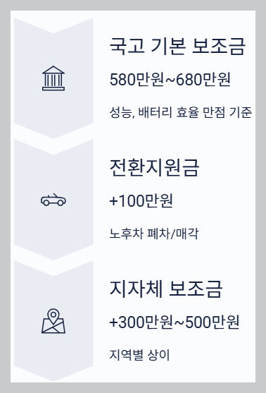 - 🔹 **국고 기본 (성능, 배터리 효율 등 만점)**: 최대 580만원 ~ 680만원 (차종별 상이)