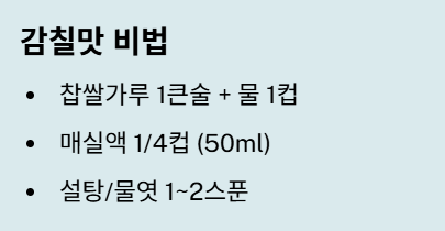 | 매실액/배즙 | 매실액 1/4컵 (약 50ml) 또는 배즙/사과 간 것 2T. |