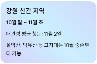 - 강원/산간: 10월 말 ~ 11월 초 (가장 빠름)