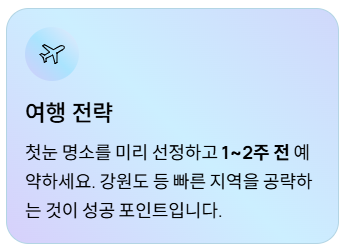 - **첫눈 명소** 검색: 눈이 와도 아름다운 국내 여행지 (예: 제주 1100고지, 전주 한옥마을, 순천만 습지 등)를 미리 찾아 동선을 계획해두세요.