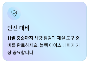 - 차량 점검: 부동액, 배터리, 와이퍼 상태를 체크하고, 스노우 브러시와 성에 제거제를 차에 구비해두는 건 기본 중의 기본입니다!