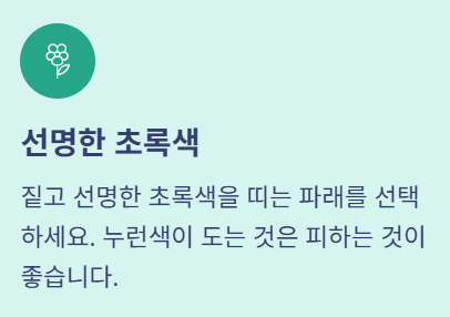 - 색상: 최대한 선명하고 짙은 초록색을 띠는 것을 고르세요. 누런색이 도는 것은 피하는 것이 좋아요.
