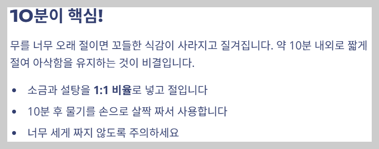 - 2. 무 절임 시간: 10분 내외로 짧게 절여 아삭한 식감을 살리는 것이 **무 절이는 법**의 비밀입니다.