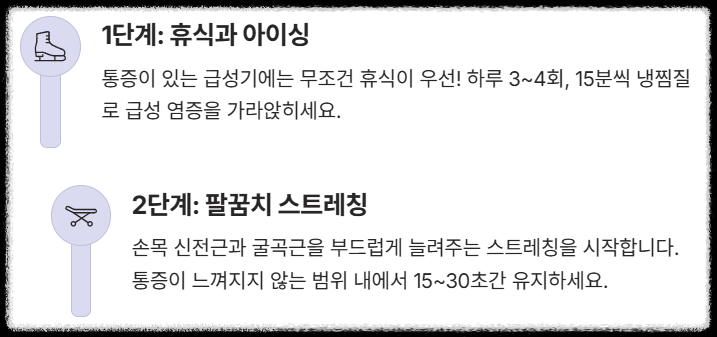 - 2단계: 팔꿈치 스트레칭: 통증이 줄어들면 **손목 신전근**과 **굴곡근**을 부드럽게 늘려주는 **팔꿈치 스트레칭**을 시작합니다. 통증이 느껴지지 않는 범위 내에서 15~30초간 유지하세요. (예: 팔을 쭉 펴고 손바닥을 몸쪽으로 당기기)