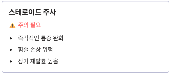 - **스테로이드**: 즉각적인 통증 완화 효과는 크지만, 힘줄 손상 위험 및 장기 재발률이 높습니다.