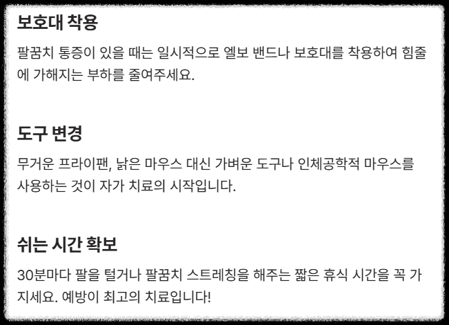 - **쉬는 시간 확보**: 30분마다 팔을 털거나 **팔꿈치 스트레칭**을 해주는 짧은 휴식 시간을 꼭 가지세요.