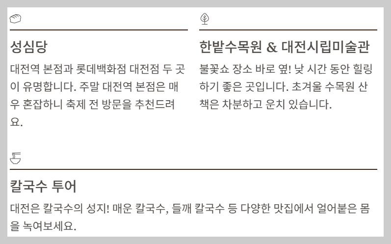- 한밭수목원 & 대전시립미술관: 불꽃쇼 장소 바로 옆에 위치한 한밭수목원과 시립미술관은 낮 시간 동안 힐링하기 좋습니다. 특히 초겨울의 수목원 산책은 차분하고 운치 있죠.