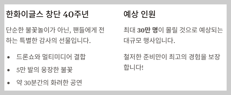 이번 불꽃쇼는 단순한 불꽃놀이가 아니라, 한화이글스 창단 40주년을 기념하고 팬들에게 감사함을 전하기 위해 마련된 특별한 축제예요. 웅장한 불꽃뿐만 아니라 **드론쇼와 멀티미디어가 결합된 하이브리드 공연**으로 진행될 예정이라 더욱 기대를 모으고 있답니다.