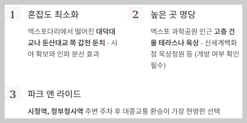 - 높은 곳 명당: 불꽃쇼는 높이 쏘아 올리기 때문에, 엑스포 과학공원 인근의 **주변 고층 건물 테라스나 옥상**도 숨겨진 명당이 될 수 있습니다. 신세계백화점 옥상정원 등도 좋은 시야를 제공할 수 있지만, 개방 여부를 미리 확인해야 합니다.