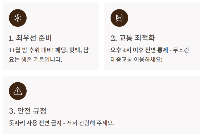 - 간단한 간식 & 쓰레기봉투: 주변 편의점은 인파로 마비될 수 있습니다. 미리 따뜻한 차나 간단한 간식을 챙기고, **꼭 가져온 쓰레기는 되가져갈 봉투**도 준비해야 합니다.