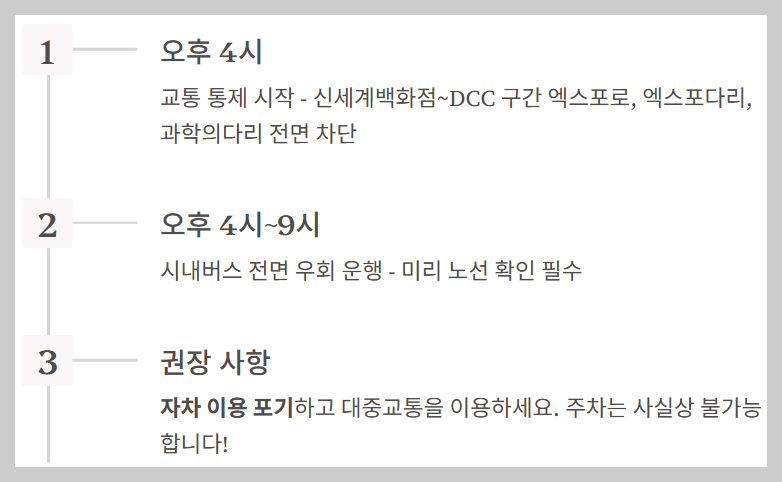- 🚗 **교통 통제 구간:** 11월 30일 (일) 오후 4시부터 9시까지 신세계백화점 ~ DCC 구간 엑스포로, 엑스포다리, 과학의다리 전 구간이 차량 통제됩니다.