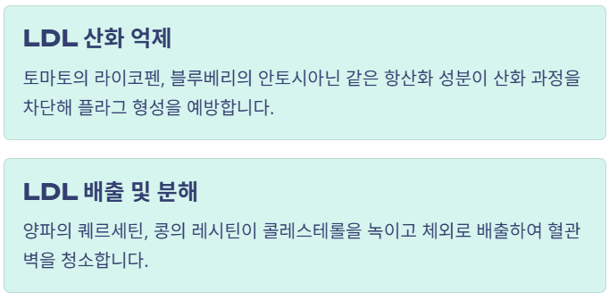- **LDL 배출 및 분해:** 양파의 퀘르세틴, 콩의 레시틴처럼 콜레스테롤을 녹이고 체외로 배출하는 성분이 혈관 벽의 노폐물을 청소합니다.