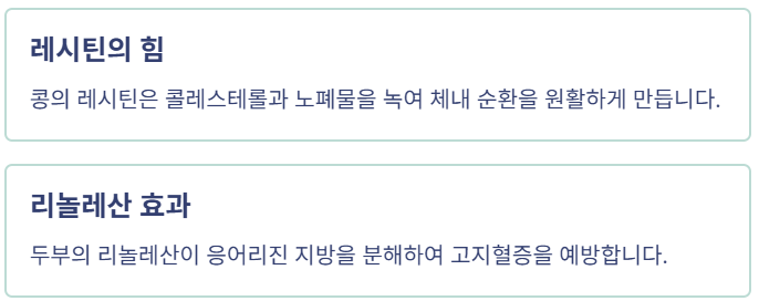 - **검은콩/두부 (레시틴, 리놀레산):** 콩의 레시틴은 콜레스테롤과 노폐물을 녹여 체내 순환을 원활하게 하고, 두부의 리놀레산은 응어리진 지방을 녹여 **고지혈증**을 예방합니다.